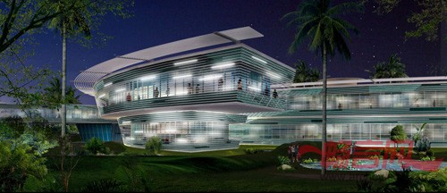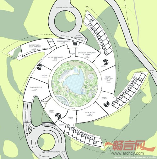 餐厅、矿泉疗养地、健身俱乐部、咖啡厅、大型游泳池和客房由中心向四周延展开,五座双层景观房像手臂一样延伸到美景中。阳台与每间客房连接在一起,既保证了隐私性,又提供了独特的室外景观。建筑幕墙采用横向百叶窗的设计方法,以减少强烈的热带阳光对建筑的影响。到了晚上,部分百叶窗将被点亮,透出微妙的颜色,仿佛神奇的灯笼漂浮在夜空中。
