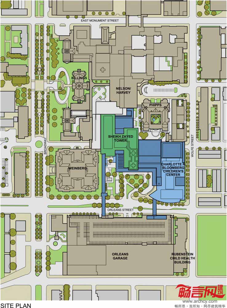 约翰·霍普金斯医院位于美国马里兰州巴尔的摩市,其新建设施综合体由Perkins+Will(帕金斯威尔建筑事务所)设计。项目设计以治疗体验为中心,融合了建筑与城市设计。项目目标是改造Charlotte R. Bloomberg儿童中心和Sheikh Zayed塔楼的治疗体验,凸显了医院以病人为中心,给予病人关怀的宗旨。