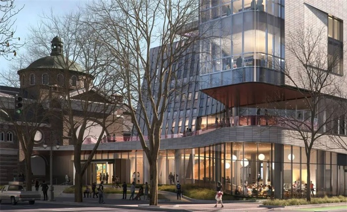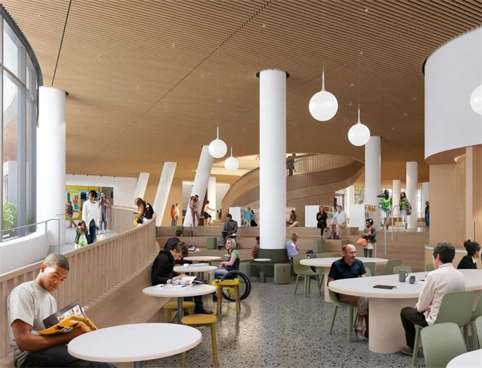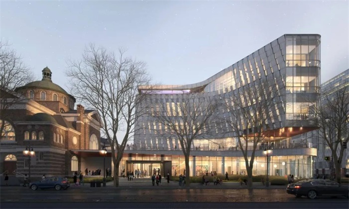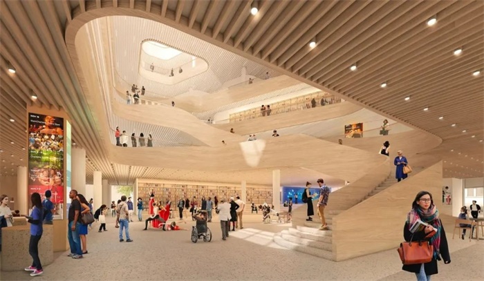 建筑共5层高,仿佛一个锚固在街角的发光的半透明“船头”,面向街道,从人行道上方挑出。这座占地11.5万平方英尺(约10683平方米)的新图书馆空间整合了21个分馆组成的公共图书系统,每年可接待340万名访客。它将不仅仅作为一个图书馆,更将成为一个公共场所,在该地日常生活中发挥重要的作用。