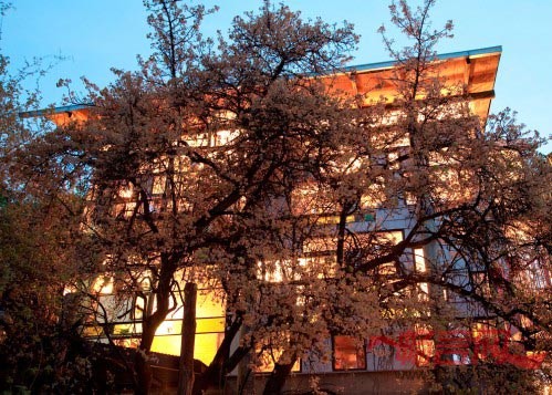 穿过一个池边栽有高大树木的庭院,跨过一座小桥,便可以到达设置在建筑一楼中间的入口。