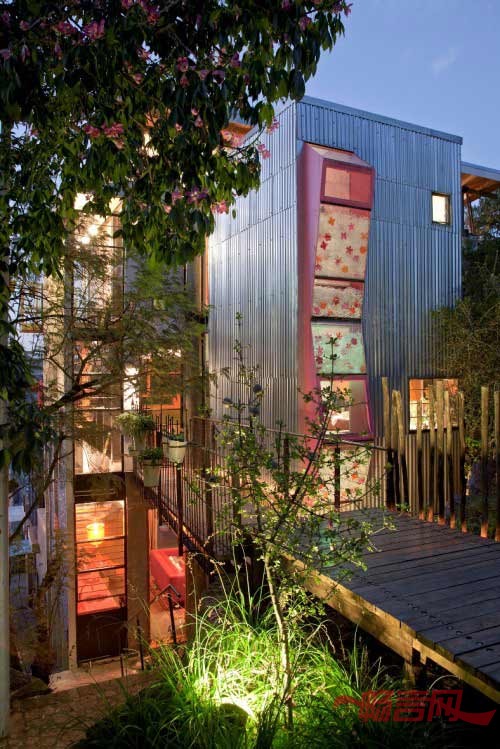 整个建筑纷繁的色彩反射了周围的景色:粉色的窗户呼应着粉色的Kjapok树木和紫红色的九重葛,而绿色和蓝色的浴箱则衬托着蓝色的白花丹。