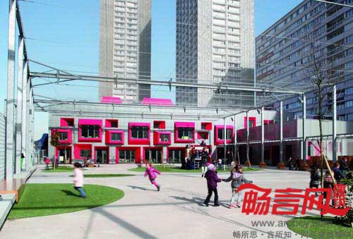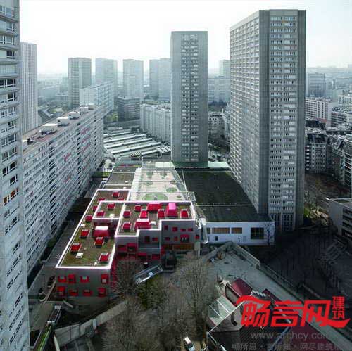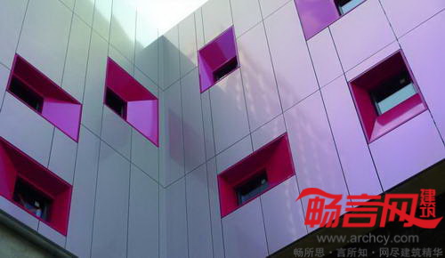 位于法国巴黎的该学校建筑围护结构对以下诸多环境目标一一做出了回应:视觉保护、抵挡四周遮阳棚、增加的天然采光、建筑热桥、天然通风。学校是首个符合巴黎市气候计划的项目。设计结果是厚实的外观,并带有多个浮雕结构:凸窗、壁龛、凹窗,在屋顶水平方向被当做天窗,并容纳空气处理设备和通风烟囱。这些多边形草莓色设计元素隐化了建筑外观,使之更为活跃生动。随着人的脚步移动、视角、天空颜色和附件建筑反射情况,铝镀层的颜色由粉色变成金灰,再转为绿色。