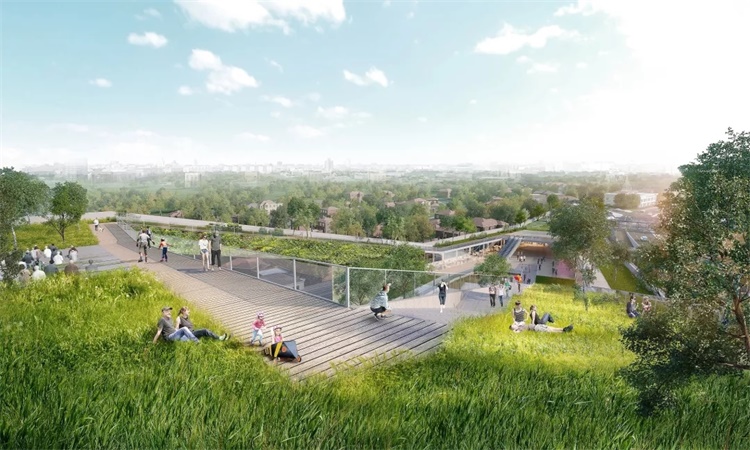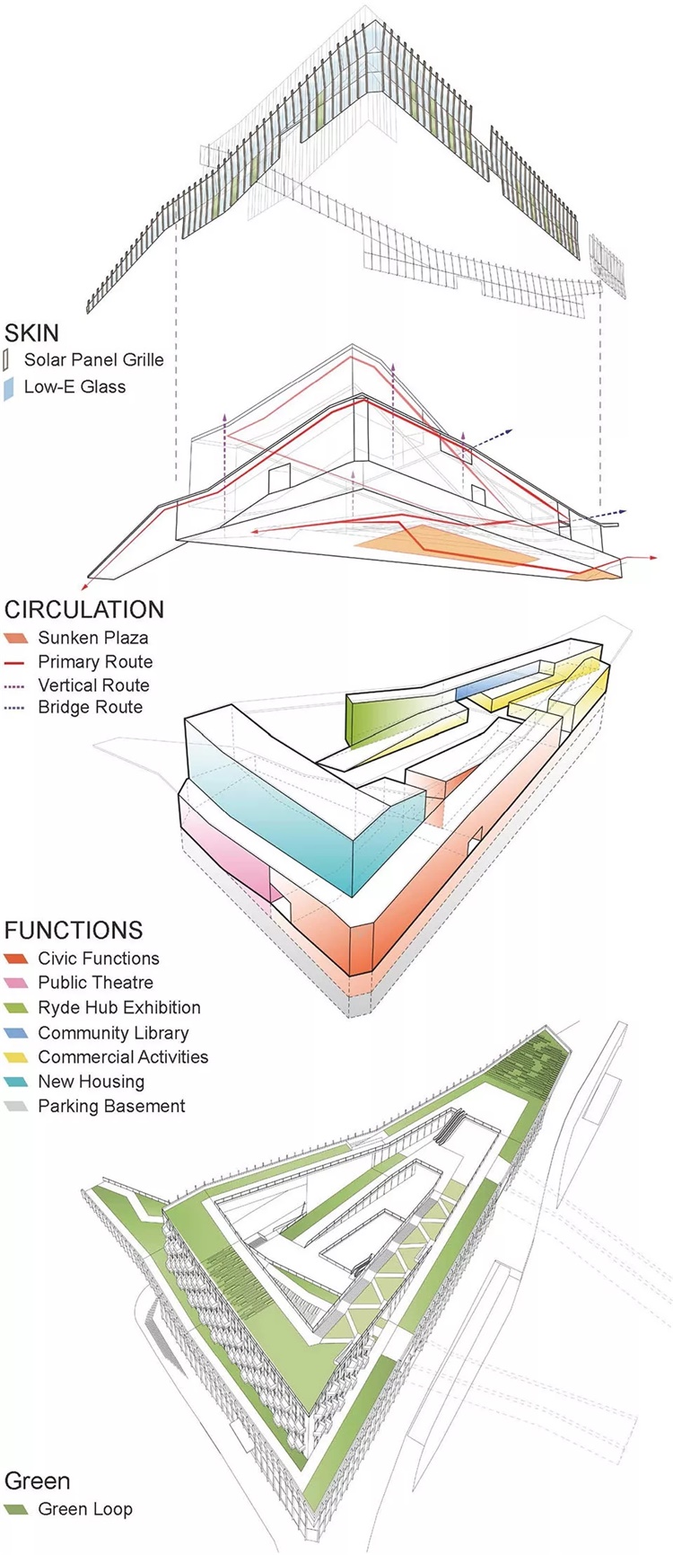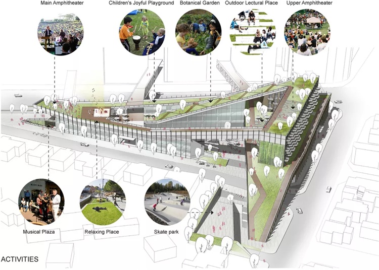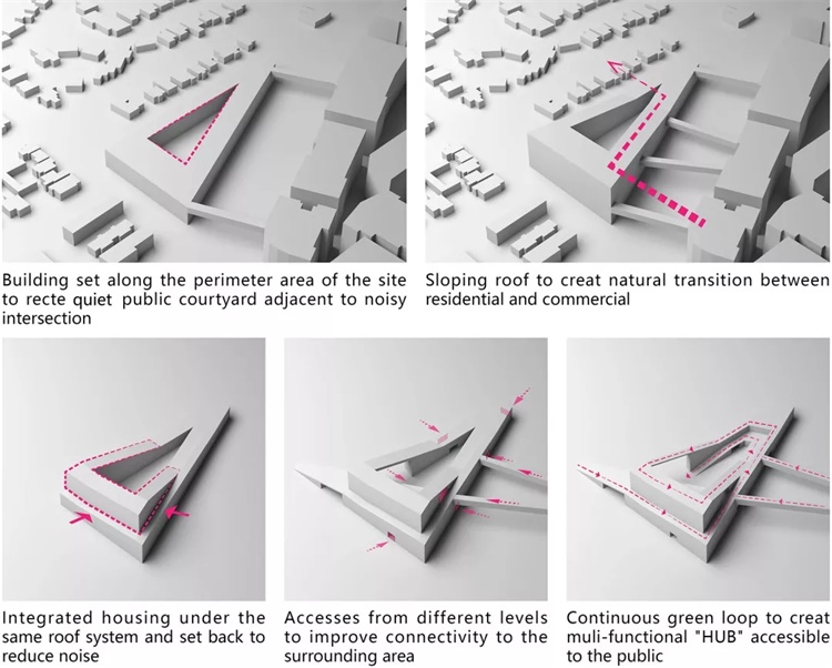本案设计的重点是环境可持续性设计和创新,希望为当地居民提供具有独特而鼓舞人心的方案,且具有可实施性。设计加强了花园式绿化郊区城市的理念 , 通过对场地形状的抽象提取形成独特的三角形绿化屋面概念,环绕场地联系各层功能与公共空间。