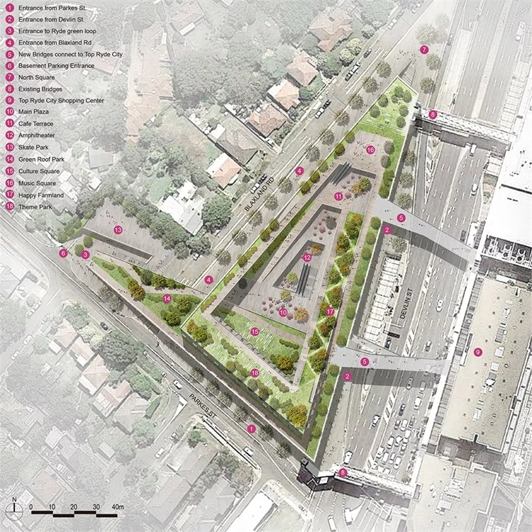项目占地 16000㎡,离悉尼市中心 12 公里,坐落在区域地貌脊线的最高点。用地东侧 260m 紧靠一条六车道高速路 , 高速路旁是高密度的 Top Ryde City 购物中心 , 用地西临市政道路并与低密度独栋居民住宅区隔路相望。项目处于城市发展的商业走廊 , 但因位于地势至高点而不利于与居民区的协调。