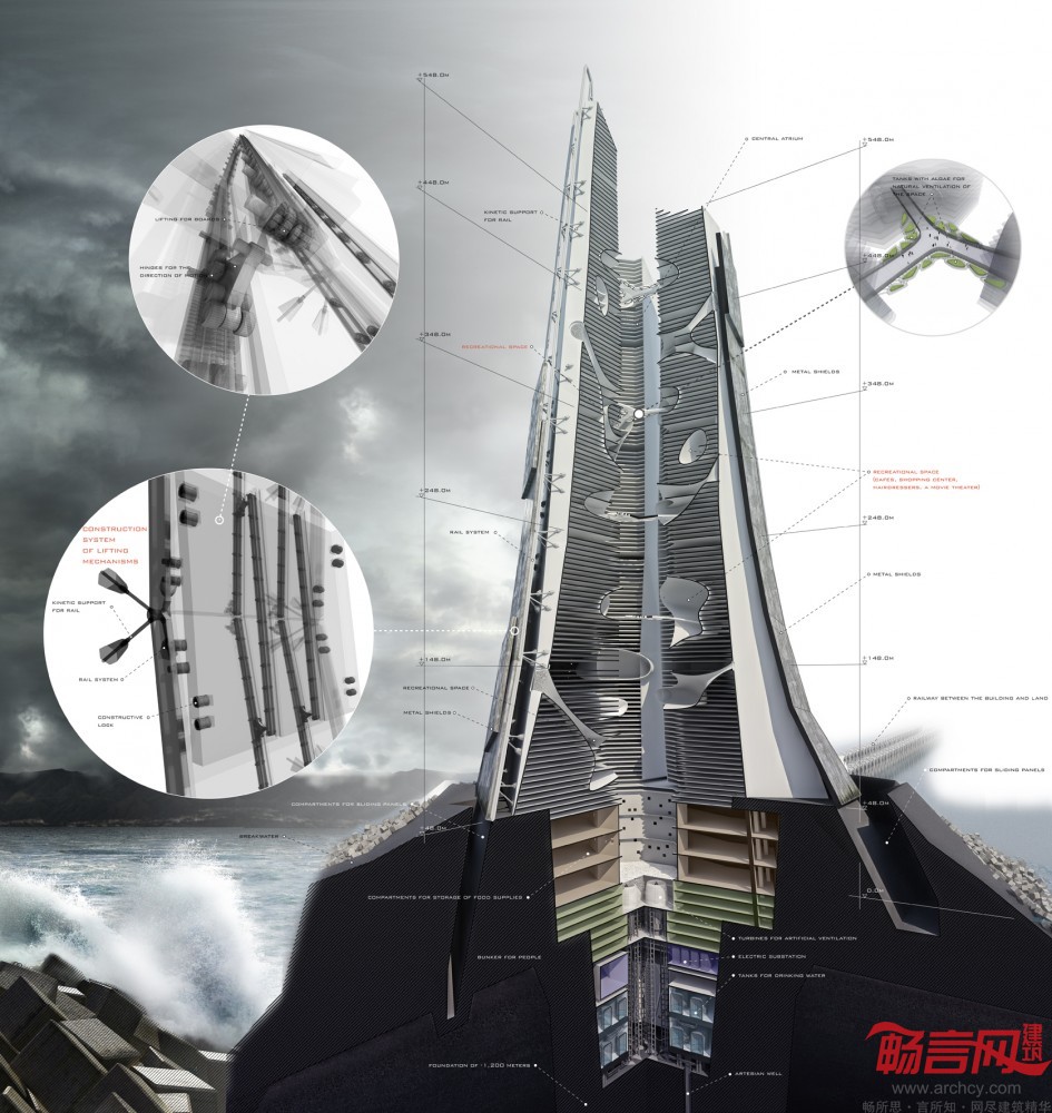 摩天城堡(Citadel Skyscraper)的设计方案来自Victor Kopeikin和Pavlo Zabotin,该方案将摩天大楼与居住城堡完美结合,打造出一个可以抵御人为损坏和自然灾害的坚实的摩天城堡。