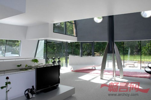 通过与客户Anton Schouten先生和Hannie Kempink女士的密切合作,Factor Architecture事务所设计的这所带有未来主义的,甚至有点古怪的现代住所不是能在格尔德兰荷兰省这样古朴的贝克贝亨村中能找到的。这所形状独特的住宅采用分裂式结构设计——具有当代感的主立面配以现代化的屋顶。住宅的一面为凉爽的白色混凝土外墙,呈现出一个大的锥形结构;另外一面则是拱形屋顶的延伸部分,遮盖着住宅主要的生活区域。室内的装饰设计具有真正现代的都市气息。简单的背景完美地阐释了住宅最奇妙的地方——那就是沿着墙面设置,点缀着现代风格屋顶的大小不同、形状各异的窗户。