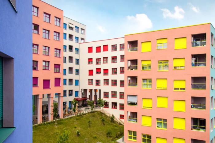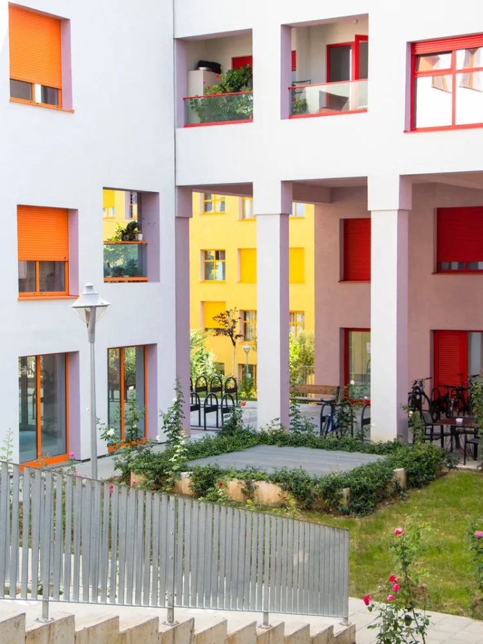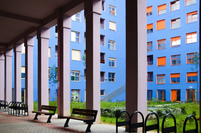 色彩在整个开发中形成了一个丰富的、多样化的层次,使整个社区更具生命力与个性。该项目对色彩的大胆运用,源自地拉那前市长埃迪·拉马(Edi Rama)于 21 世纪初发起的城市改造计划——为共产主义时期遗留的公寓楼群刷上缤纷色彩。通过精选的有限色系,以不同组合方式应用于建筑外墙、窗框和百叶窗,使每栋楼的外立面都呈现出独一无二的视觉表达。每一个庭院都拥有独特的色彩,以此来强化空间的识别性,增强社区归属感。
