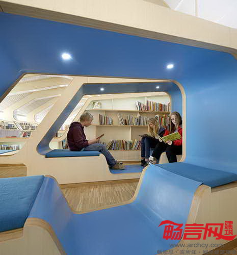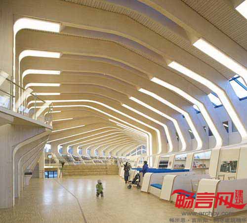 挪威Vennesla图书馆和文化中心由Helen & Hard建筑事务所设计,墙面和天花采用了木质弯梁,并结合使用了灯光、书架和座椅等设施。