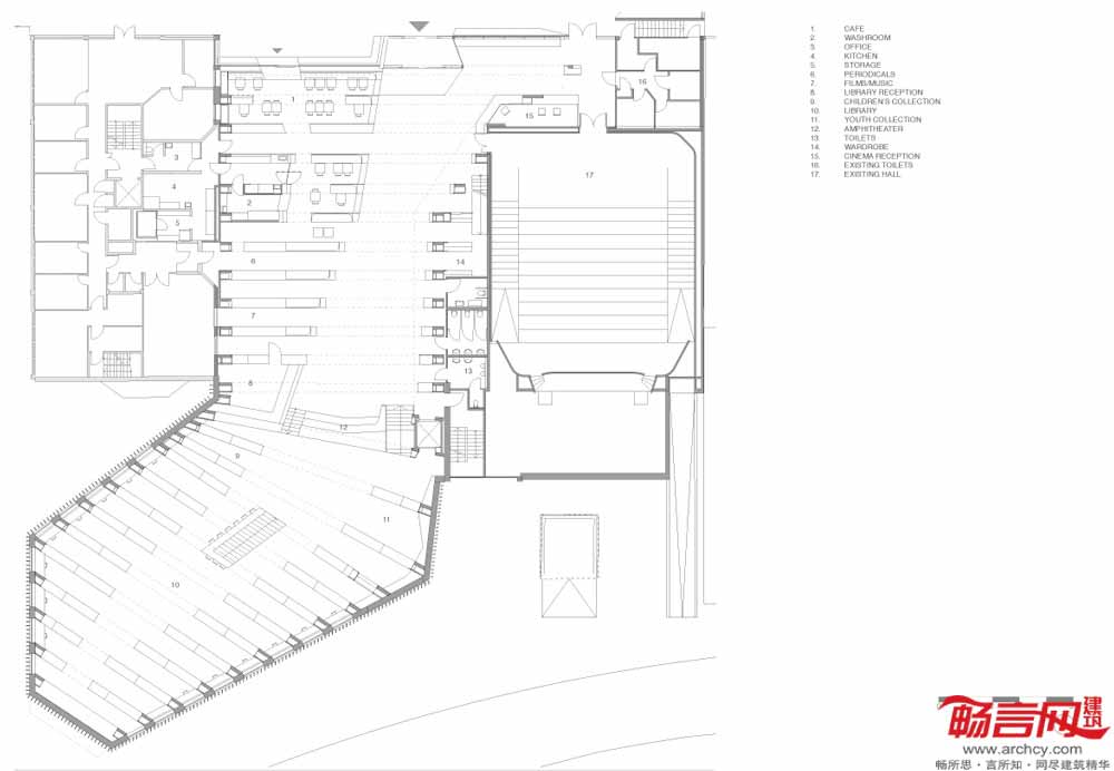 现有建筑位于图书馆的两侧,自然光通过玻璃立面照射进来,建筑前方的立面未受遮挡,而背面则被木质板条覆盖。