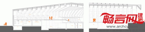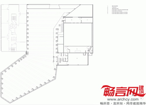 使用黏合剂合成的木梁和木柱形成了各个弯梁的结构,而空调通风管被设置在照明设施与复合板箱之间。
