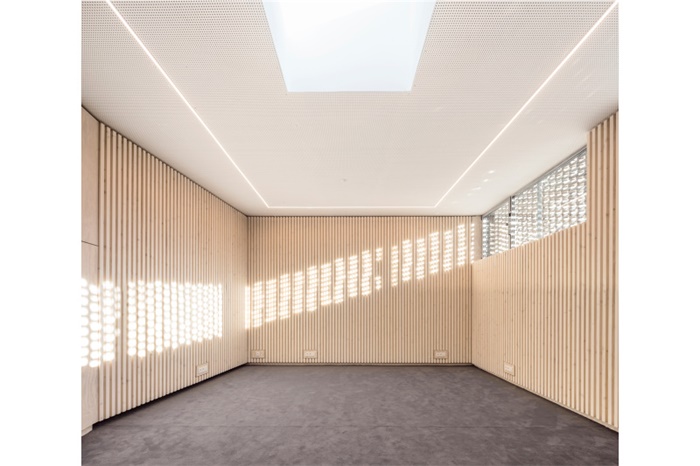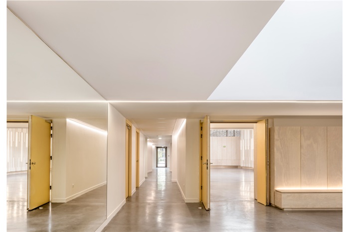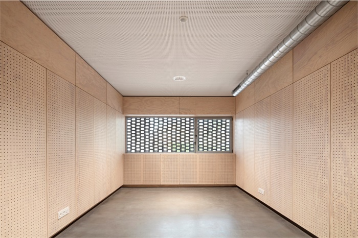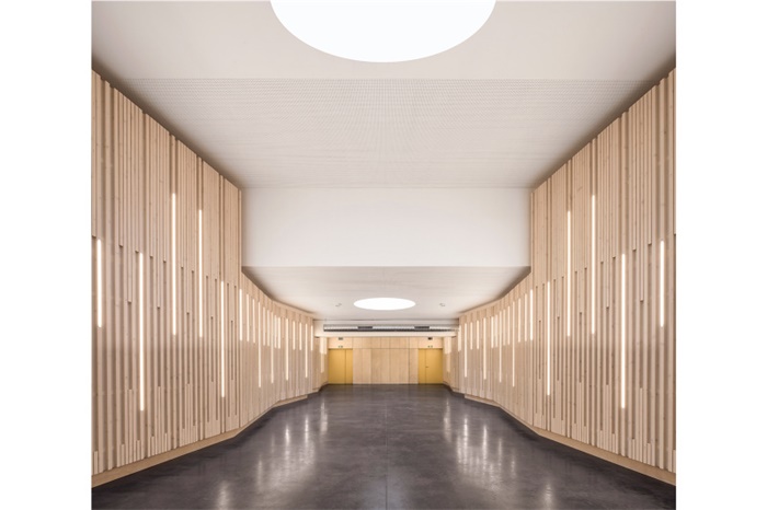 室内设计使得音乐学校功能分区更为明显,同时也符合保留原建筑精神的需求。项目符合现有的设计标准,便于行动不便人士的出入,符合防火规范、温度舒适、能源经济、声学质量以及其他音乐学校特别关注的性能要求,采用深入综合的建筑手法。目的是寻找合适的室内布局,体现对原有结构的尊重,保留自然光源,特别是保留高侧窗进入的自然光线。50平米的模块使分区和建筑结构都便于柱网分隔,避免与周围的玻璃墙面冲突。双层暴露的接待区设有采光井,令人联想起原建筑的中央无柱空间。