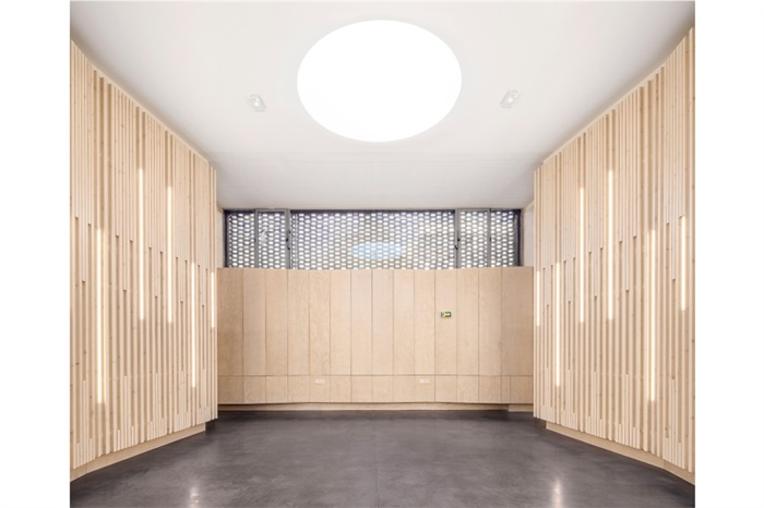 室内空间和谐、明亮、美观,项目剥离了原建筑的朴素感,使其受年轻人喜爱,保证动线的顺畅,体量、光线和材料的品质,最终打造出有趣、圆满的和谐空间。空间变得更加舒适、温馨、具有当代特色。木材料同砖块巧妙配合,让人连想乐器材料,赋予空间吸引人的丰富层次。浅色的木材带来愉悦感,视觉明亮,统一了所有墙面,轻易解决的吸音问题。墙面、地面和屋面上的涂漆木材使空间精密、愉悦。