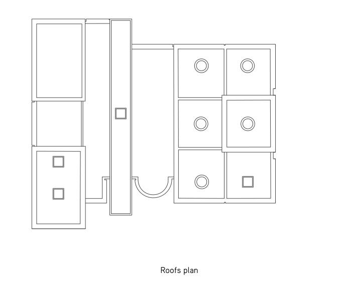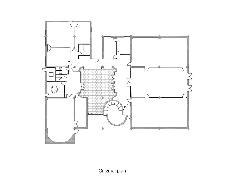 原建筑采用承重混凝土和砖砌块的忠实表达形式,没有艺术矫饰,这在80年代初是一种颇受怀疑的设计理念。原建筑很低调,采用十字形混凝土柱,构成7.2*7.75米的柱网。煤渣砖外侧是普通砖。屋顶是混凝土板。建筑缺少保温层。室内布局围绕中央庭院,有两个边厅。空间大体上是开场的,包括北侧的300平米房间,以及南侧的两个中等大小和其他较小的房间。
