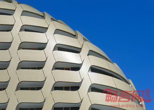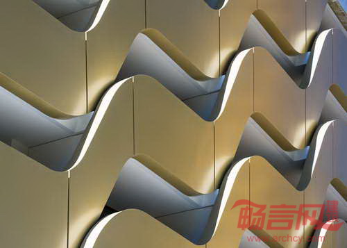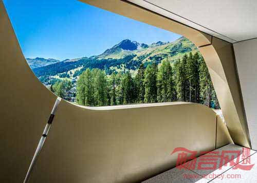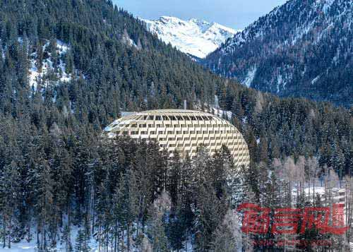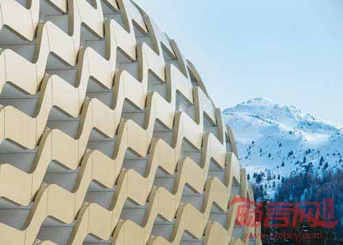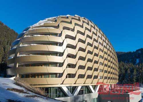慕尼黑Oikios建筑事务所设计了位于瑞士滑雪度假小城达沃斯的洲际酒店。酒店外层设有波浪形金色钢外罩板。项目坐落在美丽的阿尔卑斯小城中,建筑师Oliver Hofmeister带领团队完成了复杂的外立面。设计师表示,“项目预算有限,质量要求很高,许多专家认为外立面几乎‘无法建造’。”穹顶建筑外部环绕了起伏形、略微重叠的钢板。设计师透露这种设计来自于周边森林中的松果。波浪形钢板形成了外立面中的开孔,建筑包含216个房间、38套住宅,具有面向高山的视野。