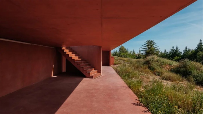 房屋位于室外平台上,南面的斜坡得以控制。这种对地形的适应性导致了较低的楼层,就像一个坚固的砌块,由混凝土浇筑而成,上面涂有氧化铁颜料,这也是该地泥土的颜色--该地以开采粘土和生产陶瓷而闻名。