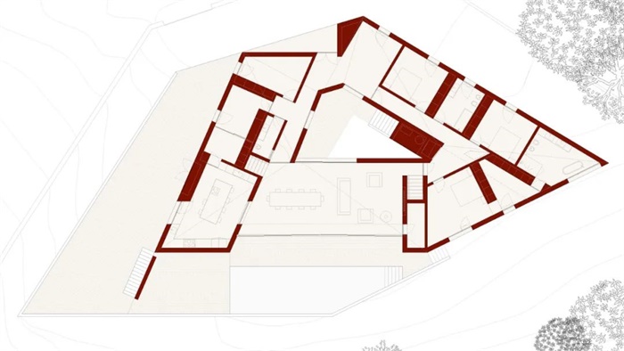 房屋位于海拔最高处,可以俯瞰山谷美景。房屋顺应地形,内部围绕天井布置,优化了太阳照射和自然通风,同时提供了室内外空间的交叉景观。