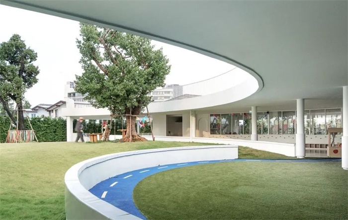 建筑环绕着一个开放式庭院,设有一个大型室外景观游乐场、一个室内游乐场以及一个游泳池。教室围绕中央游乐场设计,以保证从每个教室都能直接进入。这样的布局至关重要,因为学校的理念基于 “绿色 “课程,至少有 50% 的活动在 “真实世界 “的户外环境中进行。
