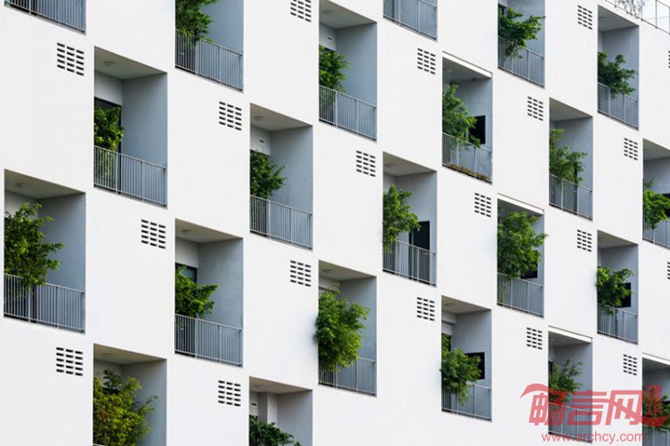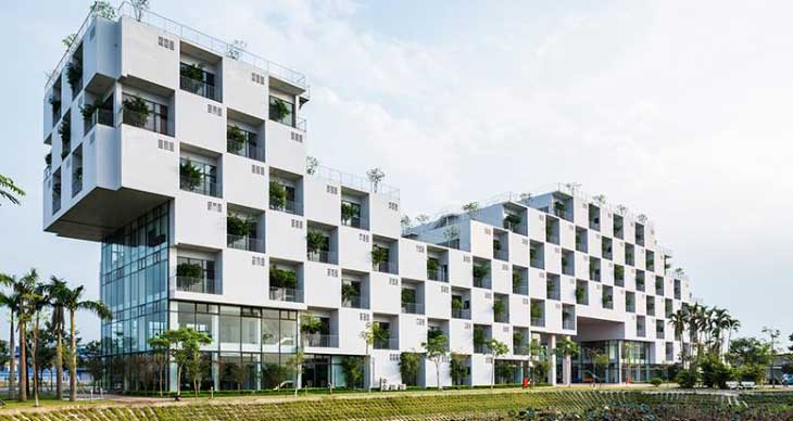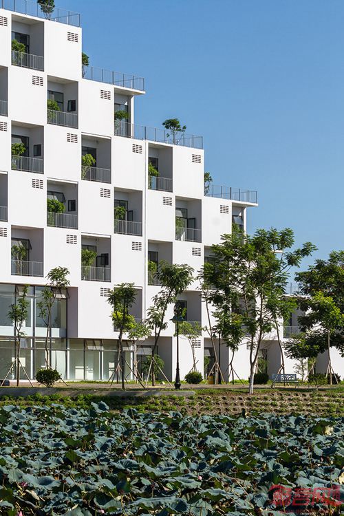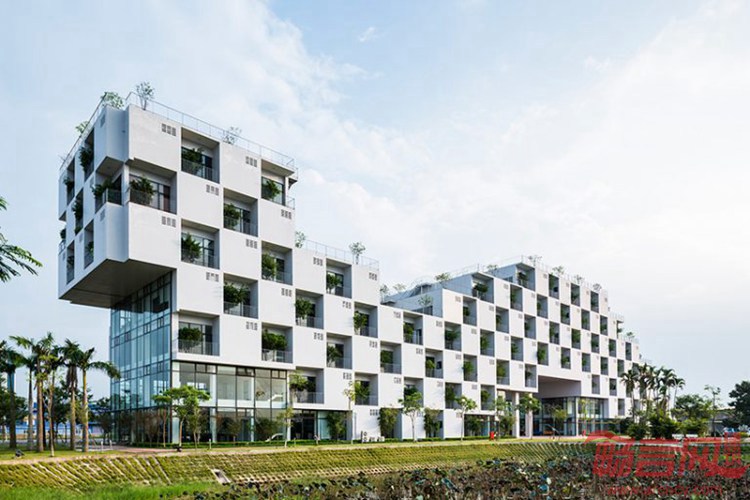 项目由VTN事务所设计,FPT科技楼位于河内,是建立带有领先环保理念的越南大学的总体规划的初期项目。作为校园门户,建筑结构包含简洁模块,带有醒目的棋盘格构造,凹陷空间设有自然植物。在这里,树木成为一层绿色表皮,降低窗户接收的热辐射。由于大学所在地区经常出现能源短缺,VTN事务所应用被动式,减少项目的能源依赖。项目削减人工照明,较浅进深保证自然采光。线性结构朝向主要风向,利用空气对流,实现降温。树木和临近湖泊帮助进一步降低气温。