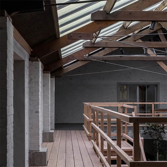 该建筑一直被Laurence的家人和当地居民称为“toebak工厂”。虽然这里的烟草已经不复存在,但人们对于“工厂”的印象却一直保留了下来。为了向建筑的历史致敬,Going East团队将植物学的概念引入到了改造设计当中,它不仅暗示了所有干预策略的灵感都从烟草加工的过程开始,同时也代表了室外和中庭新温室屋顶下的绿色环境。