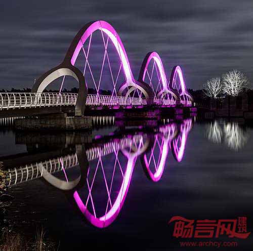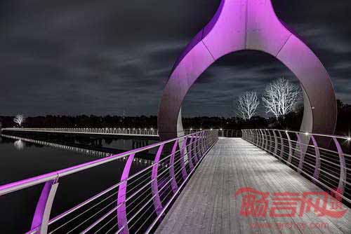 Ljusarkitektur建筑事务所设计的Solvesborg桥配合独特的灯光照明方案,提升了其作为建筑地标的地位。项目采用Lumenpulse出产的变色LED照明产品,装点了这座被认为是欧洲最长的自行车和行人高架桥。为了凸显醒目的户型结构,总长756桥身上安装了照明灯。此外,为了不对当地野生动物产生不利影响,设计公司添加了深色的定制遮光设备,遮挡了光源。受地区动植物影响,设计公司在全年不同季节进行灯光颜色次序调整。