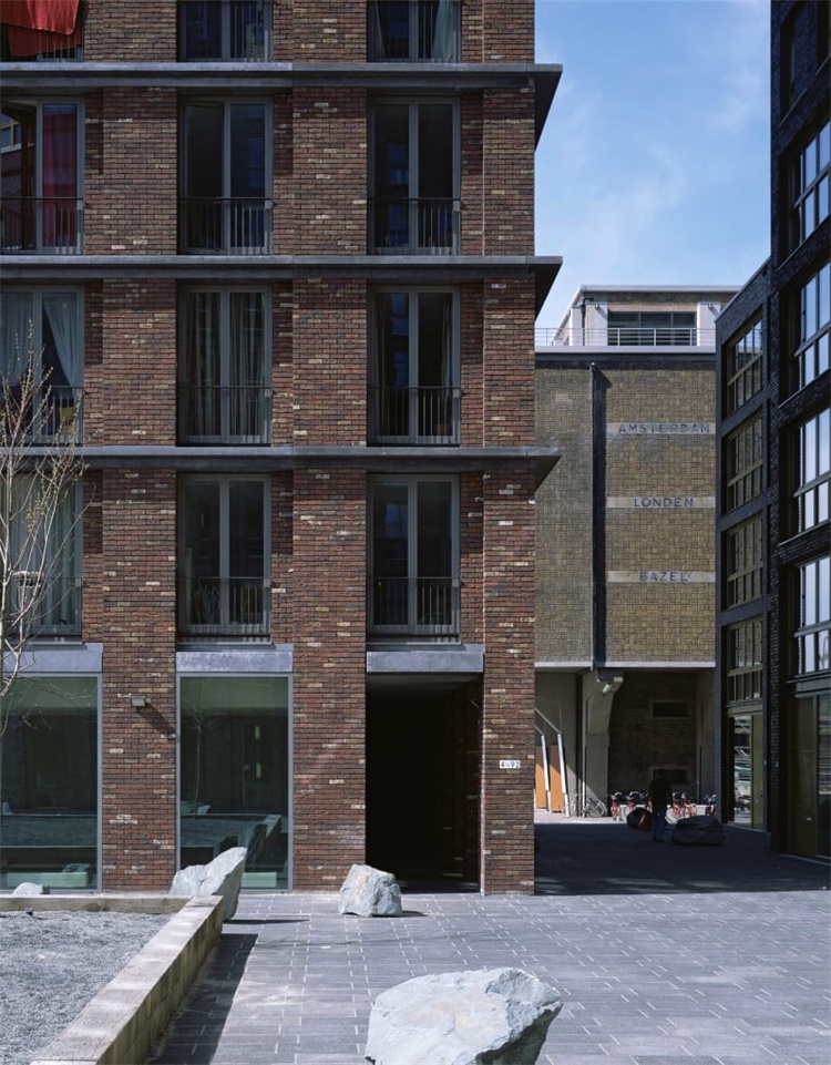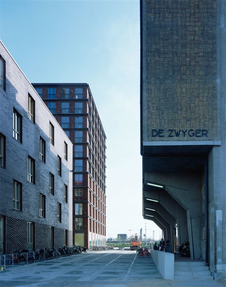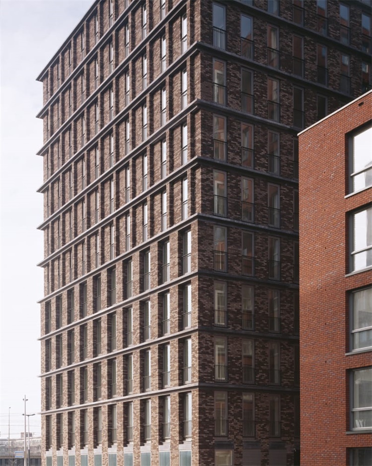 DE LOODSEN建筑群由6座11层塔楼和2座5层建筑组成。2座独立住宅楼占据了街边角落。和仓库一样,这两座塔楼设计均为初始结构,业主和租户可以在很大程度上自由决定房屋布局。2座塔楼独立,同时相互关联。尽管体积、开窗和砌砖颜色有所不同,但通过连续使用水平混凝土和砌石桥墩连接起来。
