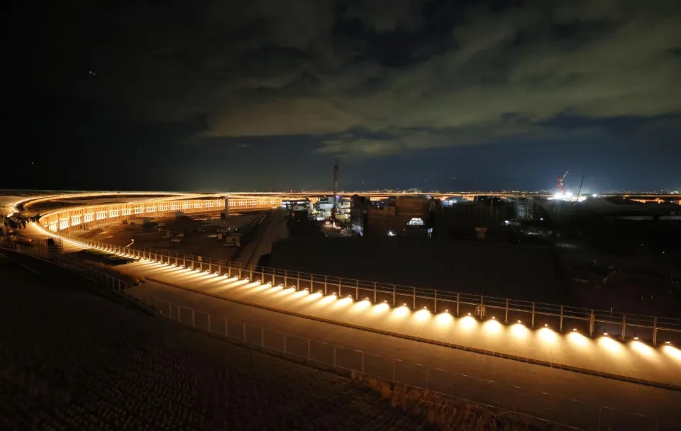 11月21日,2025年大阪世博会的巨型环形木结构回廊进行首次灯光测试,借助LED照明,约2公里的“木环”变“光环”浮现在夜色中。