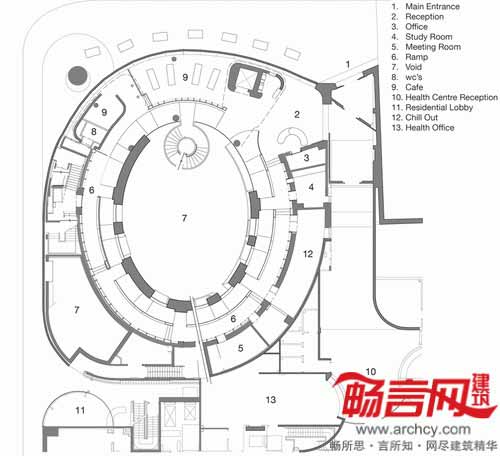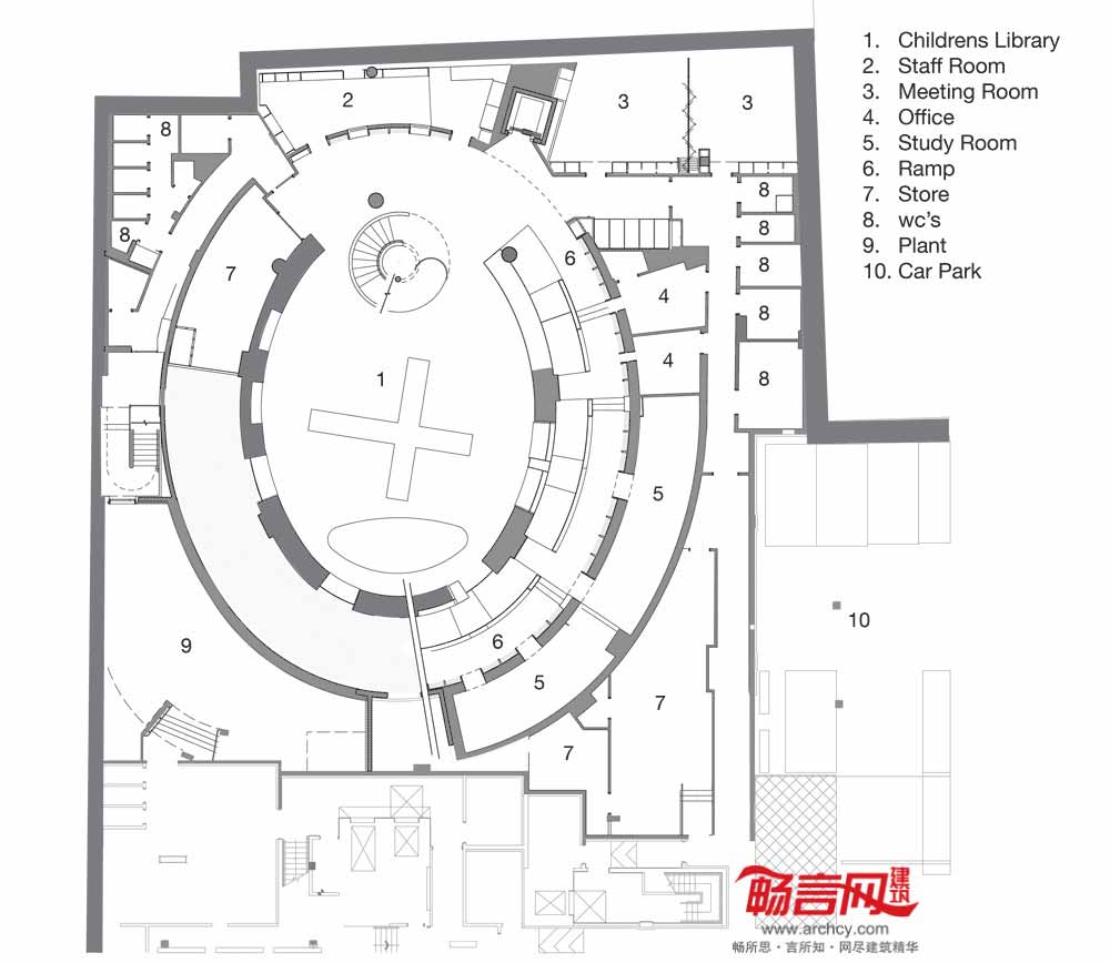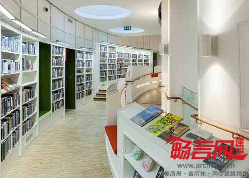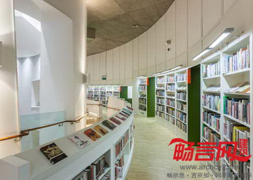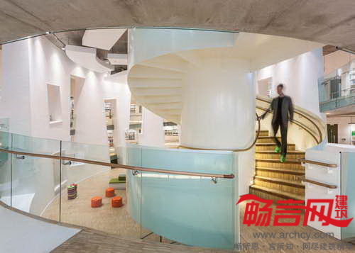 在图书馆内部,从地下层的咖啡厅和儿童图书馆到一层的阅览室,沿着宽阔的螺旋状斜坡一路向上摆放着图书架。