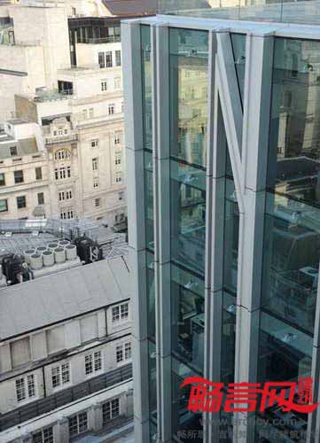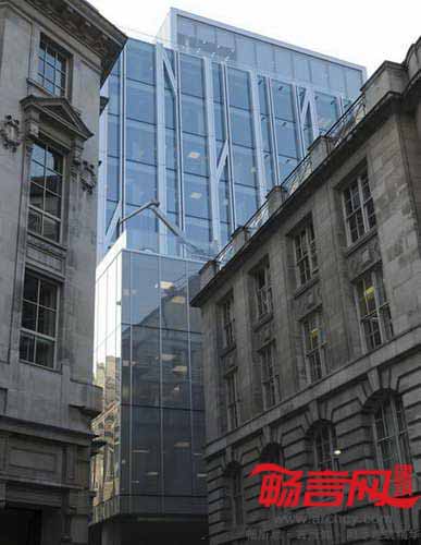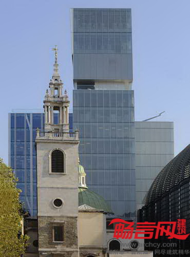 玻璃立方体从屋顶凸出,并在高度上俯视周边建筑——包括James Stirling设计的家禽街一号大楼和Christopher Wren设计的圣史蒂芬·沃布鲁克教堂。