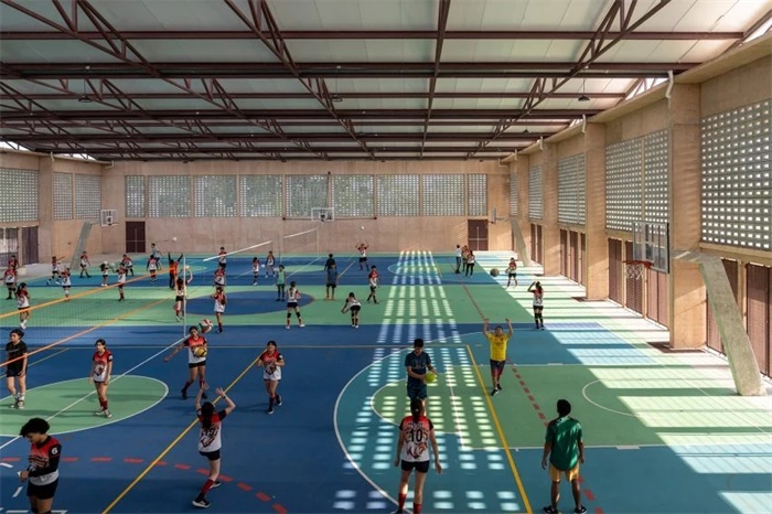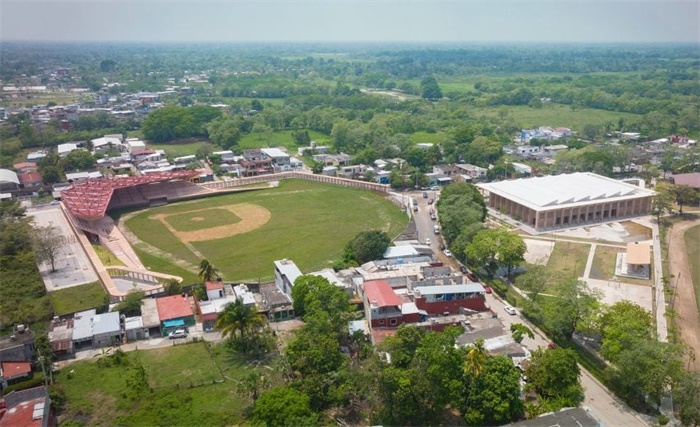 墨西哥设计工作室Centro de Colaboración Arquitectónica在墨西哥Jálpa de Mendez建造了一系列建筑,围绕着一个体育综合体和棒球场,周围有巨大的混凝土遮阳伞。