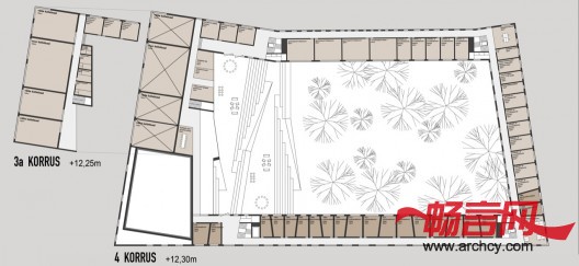 在设计建筑的功能分区的时候,空间的灵活使用是一个重要考虑因素,因为这样能与建筑里需要经常变换使用空间的功能相适应。公共空间(例如音乐厅)面朝人来人往的街道,而音乐室和宿舍则靠近静谧的花园。此外,建筑的室内还可以进行再次布局,这就可以满足学校未来建造更多功能区域的需要。各个楼之间的距离很大,这便能让花园遍及各个大楼,而每座大楼的玻璃窗则将室内与自然连接到了一起。