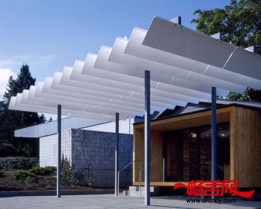 增设入口遮蓬是为了将茶馆与人行道与马路连接起来,这样更能突显该房屋的商业性,也使更多的行人可以注意到它。而且,有了整个遮蓬,仿佛就为房屋增建了一个庭院,人们可以在此品茶乘凉,十分惬意。遮蓬是铝制百叶窗式的,其外观涂为白色,它由下面的镀锌框架支撑。百叶式的遮蓬位于支架之下,仿若它是飘在茶馆前方上空一样 --- 正如白云翱翔在天空,飘逸而美丽。