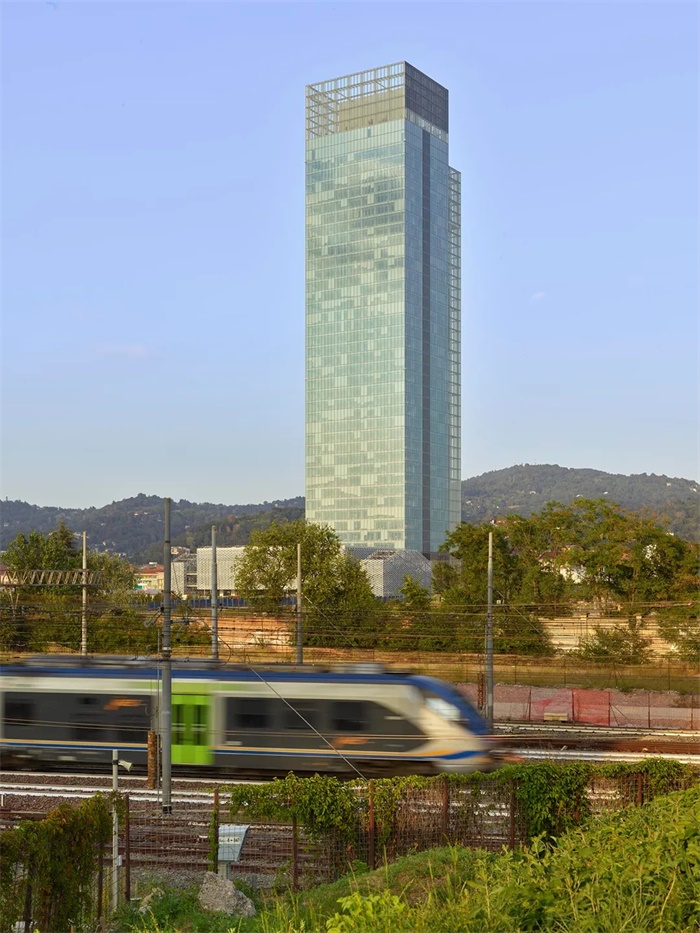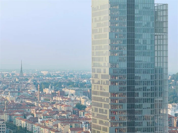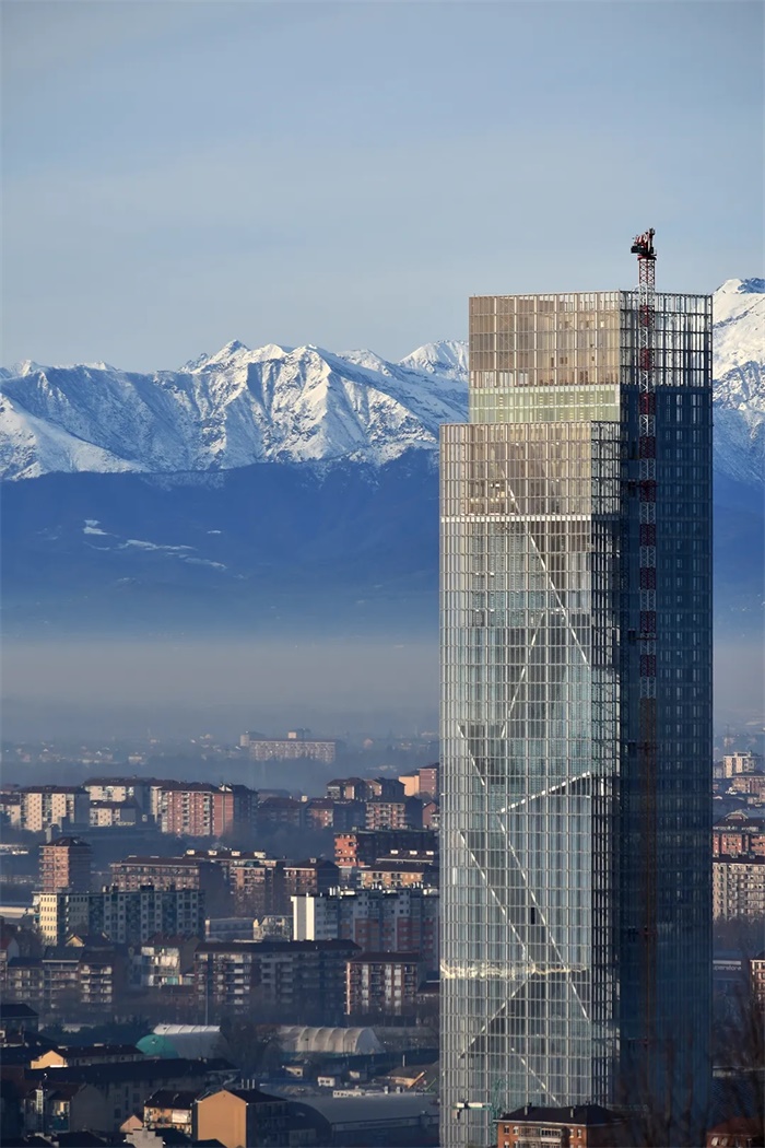 这座大厦并非一座孤立的塔楼,而是周边庞大复杂的城市区域的中心元素。一方面,它与邻近的建筑(包括在城区中十分重要的Lingotto火车站和冬奥速滑馆)在空间和功能上建立了对话;另一方面,它也在地形上与周围的自然元素,如山脉、平原、河流和山丘等,建立了平衡。