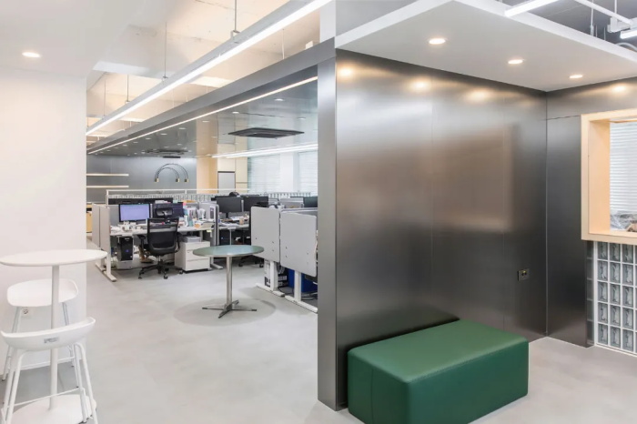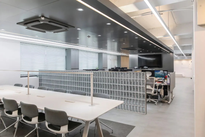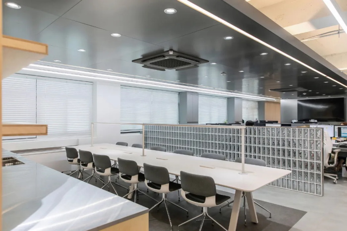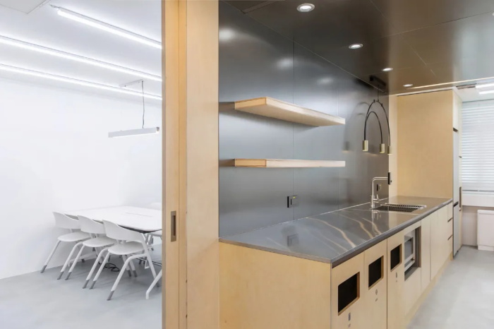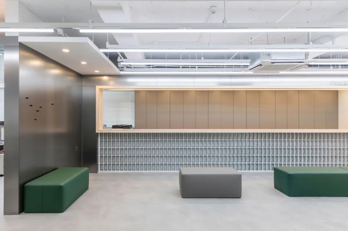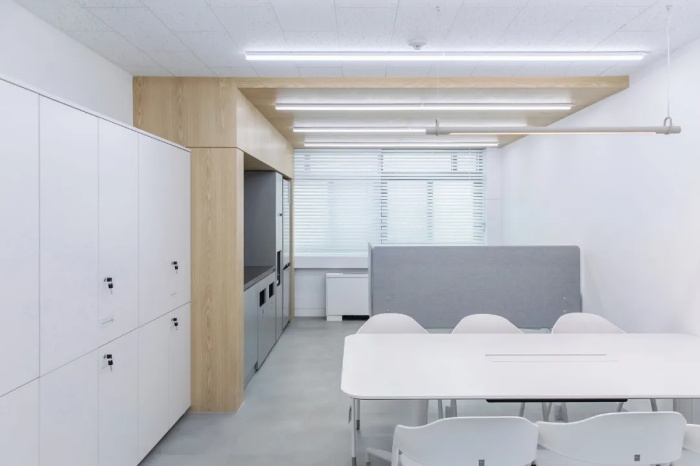 团队领导的办公室使用了胶合板来营造温暖的氛围,并在一些墙面上使用了磁性M-board,方便工作和会议。办公室空间中,低矮的玻璃块堆叠设计使得空间开阔,同时将某些区域与休息区进行分隔。窗边的储物柜既具有功能性,又能为工作材料的整理提供一个愉悦的环境。