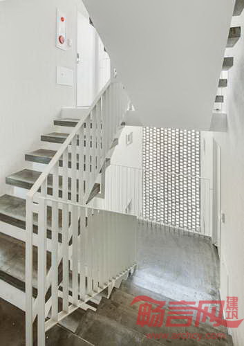 建筑师表示,“与外观形式不同,项目实质上是有两栋建筑物构成,连接它们的是一个位于独特砖墙屏障后方的半室外楼梯,最终构成H型方案。”二至五层区域包含了四种类型、共14套住宅,从楼梯平台可以直接进入这些住宅。砖石屏障使得每套公寓拥有三个方向的自然通风。屏障的图案延伸至屋面,覆盖了若干公寓的窗户,从而提升了公寓的私密性。
