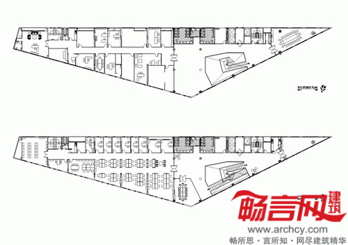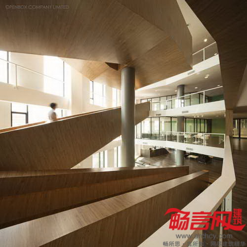 建筑内部中庭通往所有办公楼层。楼梯设计成延长型,不经意地被安放在中庭中央。