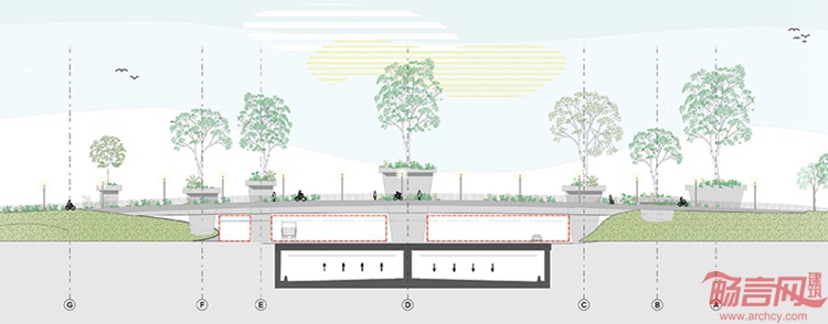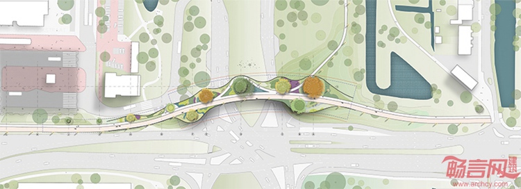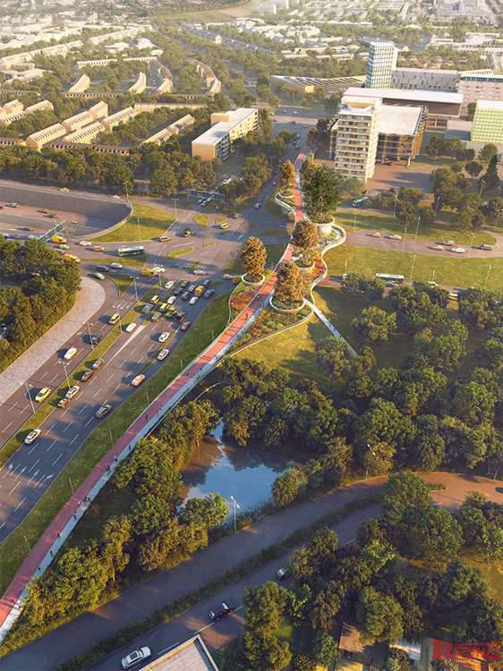 本项目对原有的乡村道路增加了独特的基础设施,Paul de Ruiter事务所同CULD合作完成了“树之桥”方案。项目位于荷兰阿姆斯特丹郊外的一个小镇,经当地居民投票,该方案成功中标。这是一个200米长的自行车桥梁,将成为A9道路的环境友好型增建设施,成为当地的一大地标。