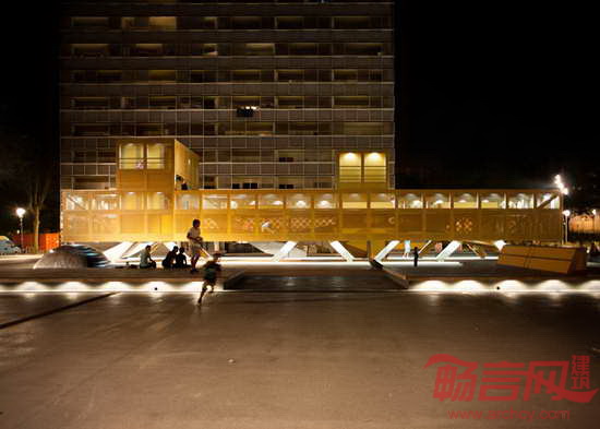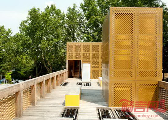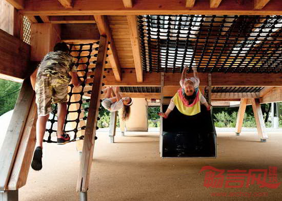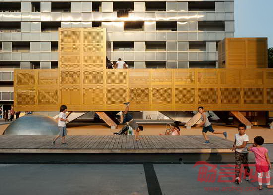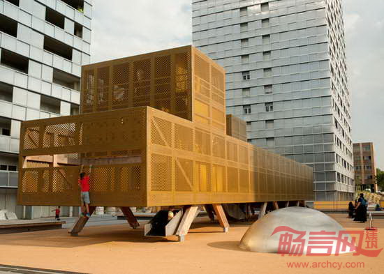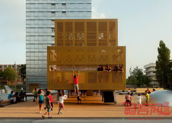 BASE公司设计了位于法国波尔多东部Lormont区的游乐场。项目旨在为一个1960年建成的社区提供游乐设施。游乐场设有滑梯、攀爬网和蹦床,运用穿孔金属板,创造半透明表皮。项目设计得到了多个建筑公司的合作,最终将住宅项目进行了翻新,创造新绿化区,体育健身设施,公共空间和人车分流道路系统。