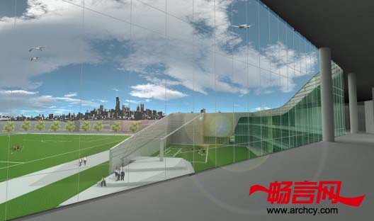 设计方案有意的想让学生能感受到室内学习区域与室外活动区域的紧密融合之感,因此,走廊都是沿外墙建造的,这就加强了教室和室外的联系。同时,学校的功能区域设计也力图将户外场地、室外功能区、室内学习区和UNO整体建筑规划全部考虑进去,合理布局。大楼的底部是几个阶梯教室和足球场,它们形成了校园的轮廓,在往上走便是教室和教师办公室,而大楼的顶部则是学生活动中心,这里与城市美景相容,意图在激励学生和附近居民不断向上、发挥潜能。同时,这也意在建造一些广阔的区域,来方便学生和周围居民的活动。该项目力图达到美国绿色建筑协会的银级标准。