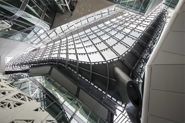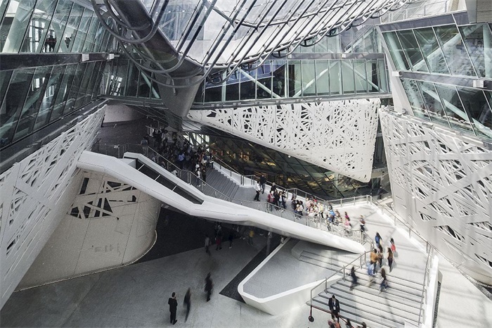 对于意大利馆建筑设计, Nemesi事务所从凝聚力概念出发,旨在作为一种吸引力,产生新的社区和归属感。社区活力体现在内部广场上,心脏汇聚了四个体量。建筑体量是大树的隐喻,在地面上呈现出巨大的支撑物,模拟沉入地下的巨大树根。从内部广场上看,建筑物开放并向上延伸,如同树叶穿过大玻璃屋顶而释放出来。