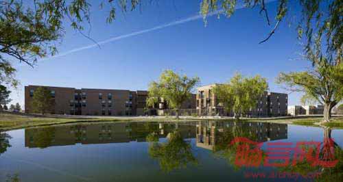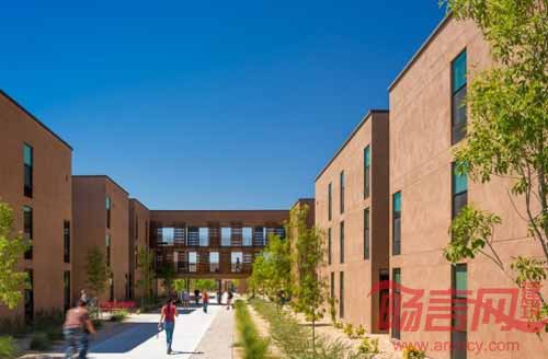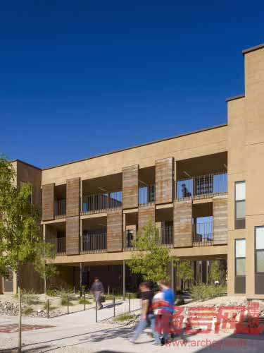 新墨西哥州立大学Chamisa Village二期工程为282名学生和教员提供了2人间和4人间宿舍。项目成为了新的大学校园门户,有助于大学营造独特、齐整庭院以及户外社交空间。