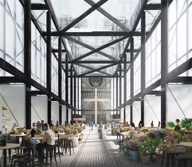 在四月的巴黎圣母院大火烧毁教堂屋顶后,Gensler晋思建筑事务所完成了一个临时宗教空间设计。坐落于教堂前的广场上,圣母院临时宗教场馆将用于850年历史的教堂修复期间,进行礼拜仪式,并用于游客和居民的集市活动。设计公司提交的方案回应了主教Patrick Chauvet以及巴黎市长的诉求,将复制原教堂大厅的尺寸,给人们熟悉感。教堂屋面将采用EFTEC轻型塑料膜,墙壁采用半透明聚碳酸酯板材。