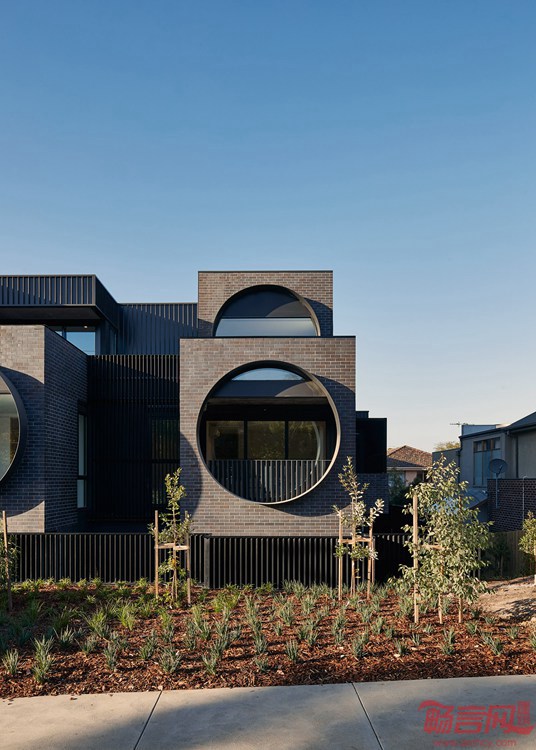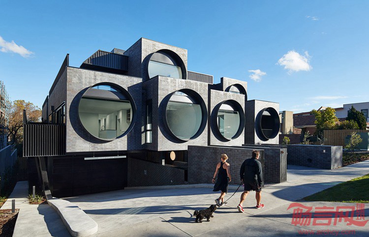 环形窗户占据了锯齿形砖砌外立面的主体,这座位于墨尔本郊区Ivanhoe East的公寓楼由澳洲BKK事务所设计。项目涵盖44套公寓,场地是一块陡峭的坡地,坐落在一个居民区内,距离城市中央商务区东北约十公里的位置。Cirqua公寓设有六个舷窗,灰色的砖砌墙面上的开窗,让墙面变得生动。