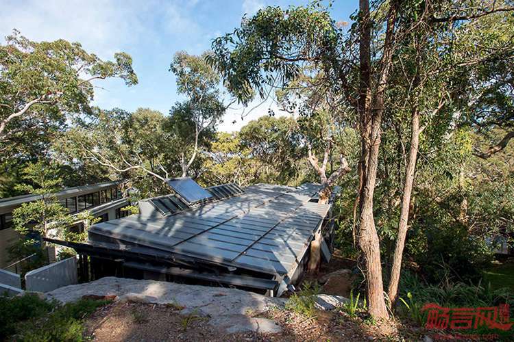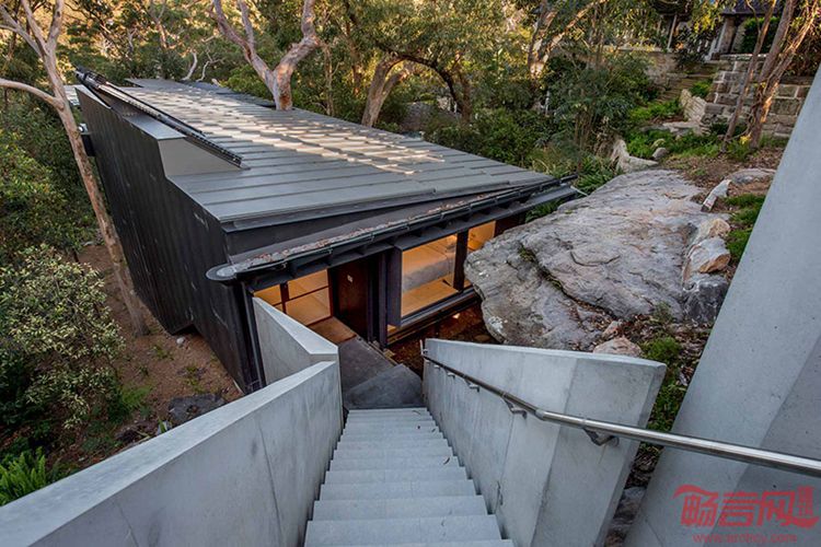 澳洲Glenn Murcutt事务所设计了位于悉尼北部棕榈滩半岛的Donaldson住宅。这一项目近期落成,正式对外销售。项目占地715平米,位于一个坡地上,周围是一片浓密的树林,同海滩距离很近,是一块陆地和海洋之间的绝佳场地。项目共有四个卧室,两个浴室,外观同环境和谐,几乎不起眼。两辆汽车停在露天的车道上,进门是若干级的混凝土楼梯,贯穿了地下层到楼上区域。