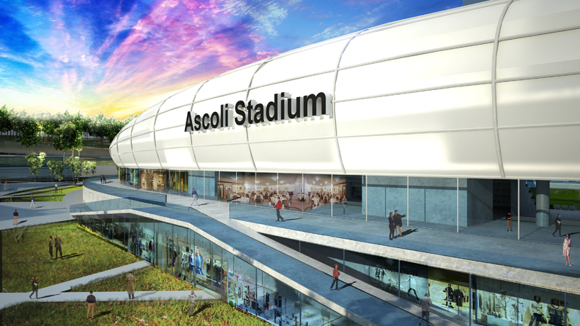 建筑师Massimo Guidotti设计了意大利阿斯科利球场。阿斯科利足球俱乐部成立于1898年,球场将成为其主场。球场占据了一块工业场地,建成后将比之前的结构更为紧凑。设计方案去除了田径跑道,因此看台距离球场仅有7.5米距离。由于南北方向的高差,设计师将方案分成两部分。一部分与街道齐平,包含商业和零售空间。另一部分是球场本身,比街道略高。