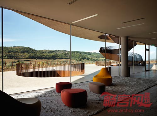 Antinori酿酒场, 是自然风光和传统酿酒工艺的完美组合,工作流程为地上采摘、地下酿酒,建筑形态带有浓郁的意大利传统文化气息与耕地风貌的特色。整个酒场建造在地下一个半球形空间里,从外观看没有房顶,没有墙壁,没有公路也没有停车场。建筑试图在寻求自然和人造的平衡点。