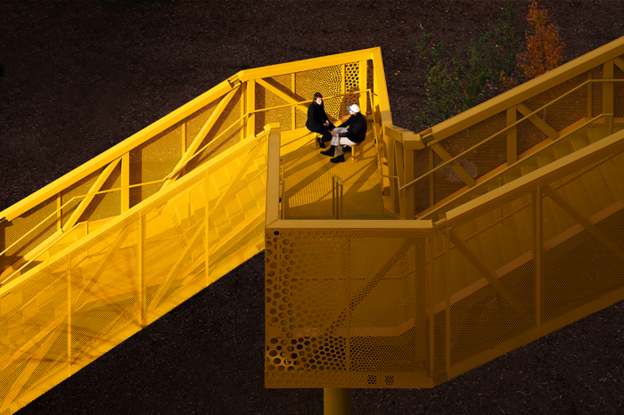 改造设计最明显的标志是建筑的颜色。原本是纯白色的建筑,现在变成了亮黄色,吸引远近的目光。一旦游客进入园区,他们会看到一个明确的标志:从园区中央广场处,一个曲折的黄色楼梯直通“Haus 1”的屋顶,楼梯平台处点缀着座位和观景台,勾勒出滕珀尔霍夫机场公园及柏林天际线的景色。