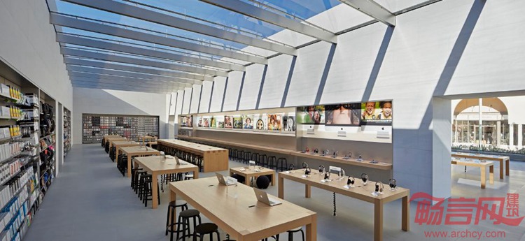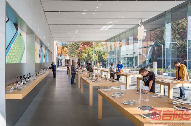 Bohlin Cywinski Jackson工作室设计了美国加州Palo Alto的斯坦福苹果店。苹果一直以来都注重设计的力量,无论是对于顾客掌上产品设计,还是对于商品陈列艺术。项目坐落于Palo Alto购物中心,商店体现了品牌的期望,将其13年来的探索进行了再度诠释。商店设有三面入口,180英尺的店面玻璃墙,是苹果不多见的如此醒目和直接的陈设。