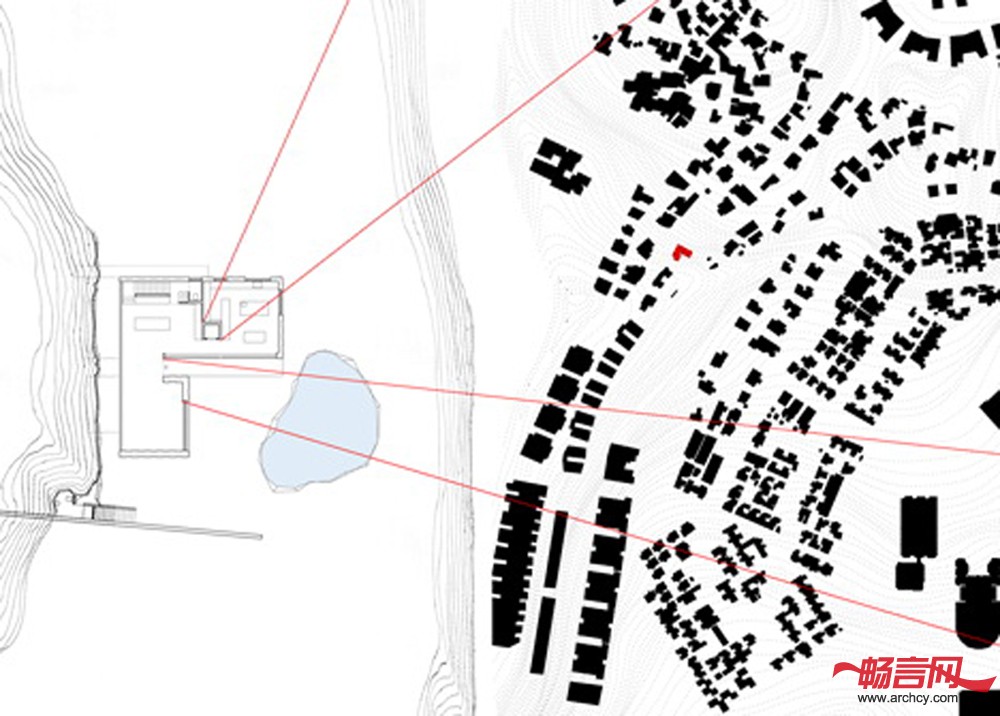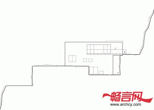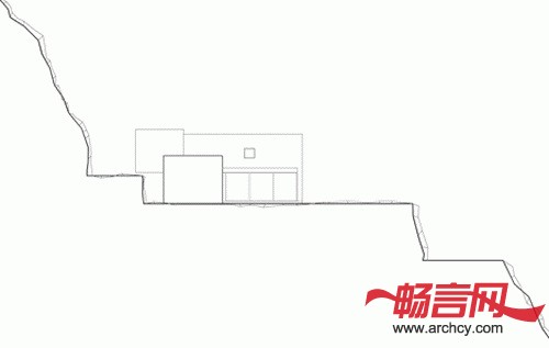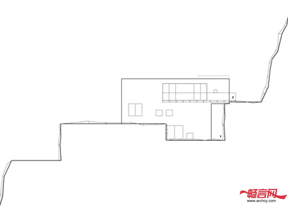 住宅的一层呈L形,它紧挨着岩石侧面而建,而二楼则从深入到峭壁的空间里面去。