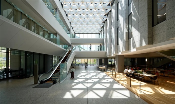 同时,其精致的细节设计和具有悬浮感的体积构成营造出轻盈的印象。低层屋檐的底边采用定制的金属银色铝板制成,与学生在其中的倒影以及公园内树木的美丽树荫相映成趣。通过这种方式,学生在校园各个场所的生动互动和活动使整个校园成为了一个舞台,营造出一个与公园和社区产生强烈相互联系的特殊场所。