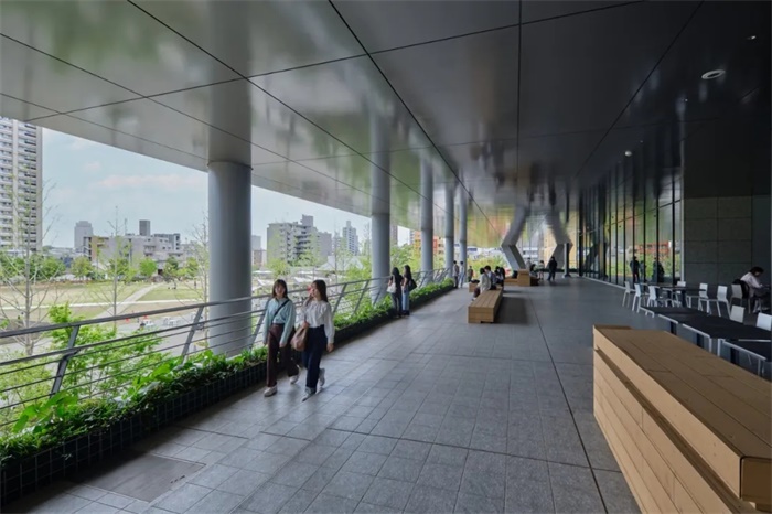 项目地点位于池袋,这里被誉为戏剧之城,立志成为国际艺术文化名城。它位于市中心(包括阳光城)与南部低层住宅区的交界处。为了保留大学校园独有的学术氛围,并融入相邻防灾公园(IKE·SUNPARK)的茂盛与开放气息,我们打造了一个以第二层作为学生基地的舞台式校园设计。